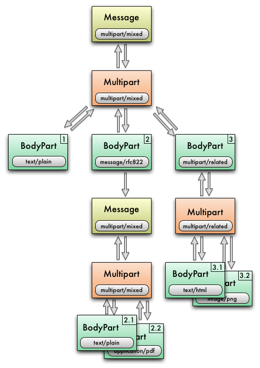 Beside plain content, A BodyPart can contain another Multipart or even another Message, a so called nested message (e.g. a message forwarded as attachment) with content type message/rfc822.