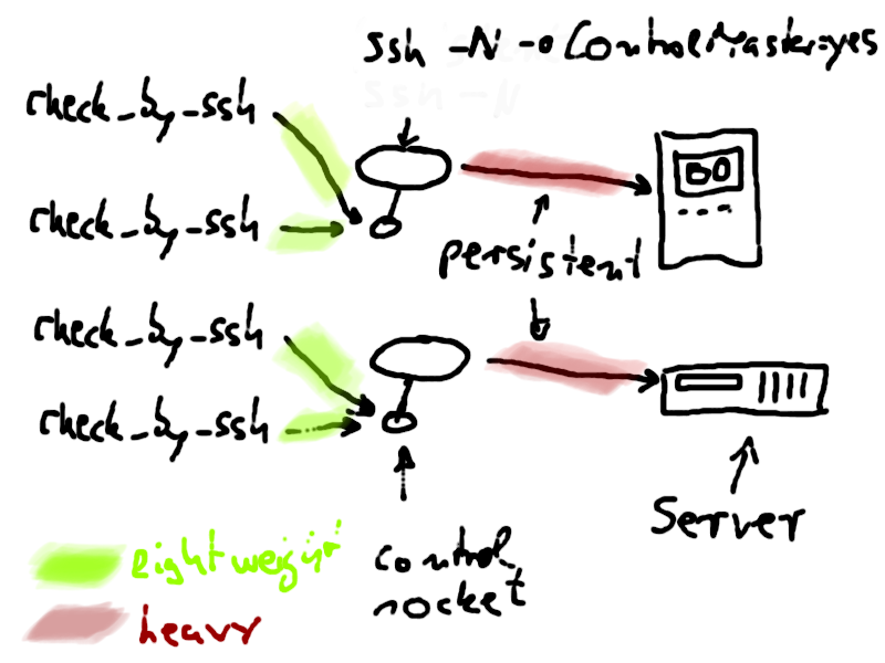 The drawback of this method is extra load on the nagios server. With every check, a ssh process is forked which has to do a complete handshake with the remote side. With newer ssh implementations it is possible to have a persistent connection which requires only one handshake at startup. All the following ssh connects use the already established connection, which saves a lot of cpu cycles. Here are the instructions to combine check_by_ssh with such a persistent tunnel.