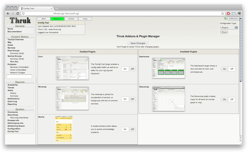 The plugin manager lets you choose your plugins. After making changes you have to restart Thruk anyway, but at least you have a small description and a preview of what you get.
