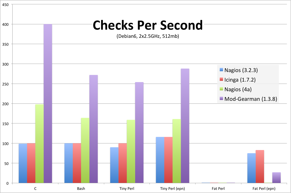 There is nearly no difference between small C, Perl or Shell plugins, but when plugins get heavier using embedded perl helps a lot. It’s faster to run perl plugins with embedded perl than running native compiled c plugins. The huge perl check is mainly limited by the underlying disk which is not very fast in our test lab but it shows the power of Embedded Perl.