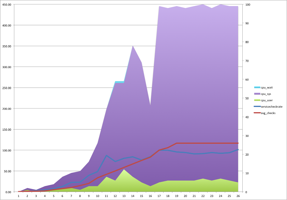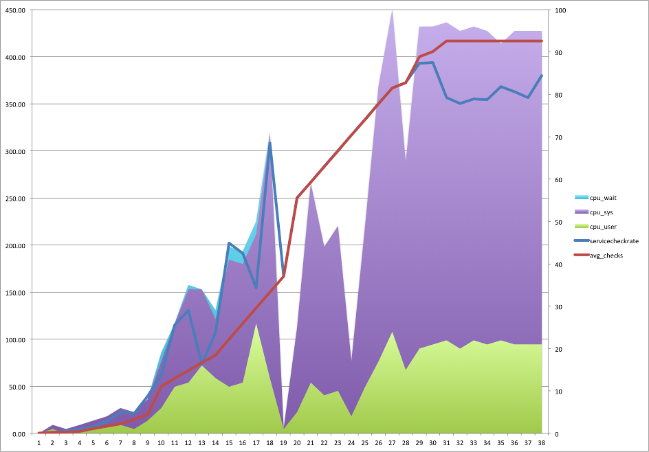 Running the benchmark with a Nagios 3 Core tops out at around 100 Checks per second.