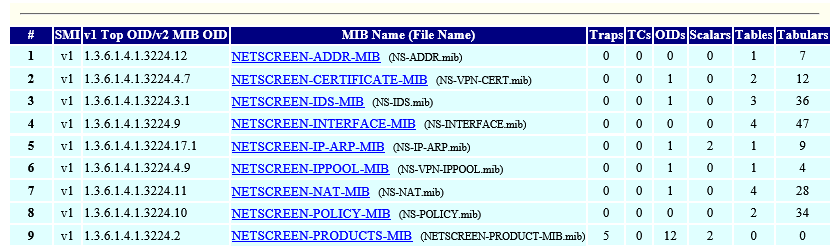 ['1.3.6.1.4.1.3224.12', 'netscreen', 'v1', 'NETSCREEN-ADDR-MIB'], ['1.3.6.1.4.1.3224.4.7', 'netscreen', 'v1', 'NETSCREEN-CERTIFICATE-MIB'], ['1.3.6.1.4.1.3224.3.1', 'netscreen', 'v1', 'NETSCREEN-IDS-MIB'], ...