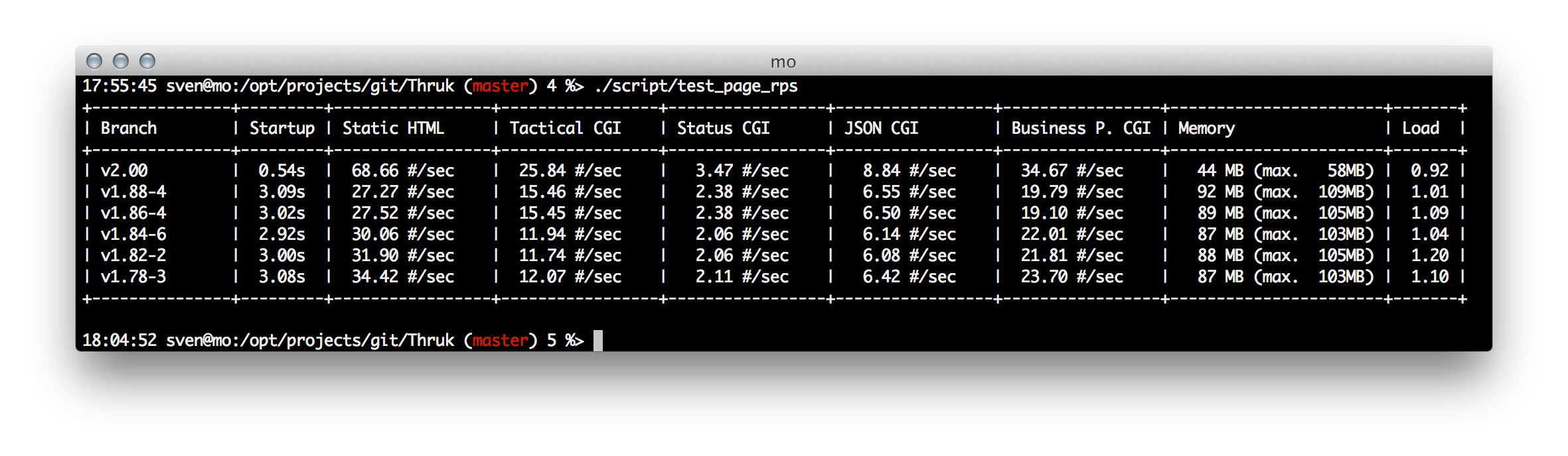 As you can see, in this example setup, the used memory is divided by half and the initial startup delay is almost gone. Besides that, a lot of dependencies have been removed. The thruk_libs have been moved into a separate package and the number of modules required has dropped from 225 to 95. This includes indirect and optional dependencies.