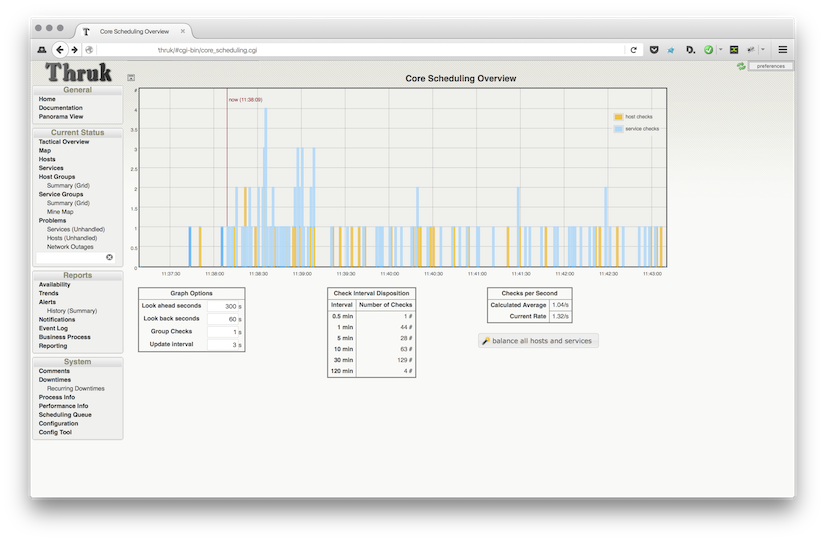 Fixing those piles of checks is easy. Just press the balance all checks button and Thruk will send force reschedule commands in order to balance out all active checks.