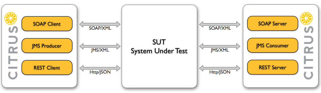 In a typical test scenario the system under test is deployed on some application server and interacts with Citrus over various message transports. During the test run Citrus is able to act on both sides as client and/or server simulating request/response messages.