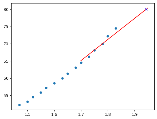 An folgendem Bild lässt sich das Ergebnis sehr gut erkennen. Die blauen Punkte repräsentieren die bisherigen Messpunkte, die rote Linie ist die Vorhersage und das blaue Kreutz symbolisiert die Abfrage, „wann ist der Wert 80 erreicht?“, was zum Zeitpunkt 1,94 der Fall ist.