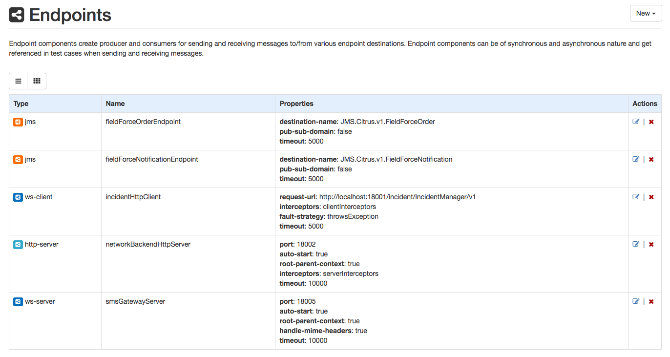 One of the major goals in the web UI is to give new users an easier way to get started with the Citrus Spring configuration. All configuration components get loaded from the Spring application context. You can view and edit those components such as Citrus endpoints via HTML forms: