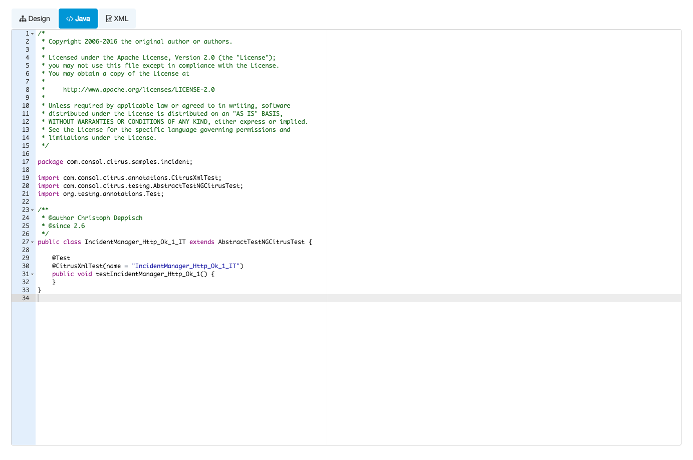 The administration UI aims to give you an additional tooling for Citrus integration testing. The administration web UI is not there to eliminate your favorite IDE (IntelliJ, Eclipse or whatever)! The UI is a helping instrument for getting in touch with Citrus and its concepts and works side by side with your local Java IDE as well as other text editors of your choice.