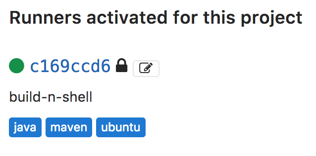 Please enter the gitlab-ci coordinator URL (e.g. https://gitlab.com/): https://gitlab.com/ Please enter the gitlab-ci token for this runner: abcdefghijklm Please enter the gitlab-ci description for this runner: [build-n]: build-n-shell Please enter the gitlab-ci tags for this runner (comma separated): maven, java, ubuntu Whether to run untagged builds [true/false]: [false]: Whether to lock Runner to current project [true/false]: [false]: true Registering runner… succeeded runner=HzUGN97U Please enter the executor: parallels, virtualbox, docker+machine, docker, docker-ssh, shell, ssh, docker-ssh+machine, kubernetes: shell Runner registered successfully. Feel free to start it, but if it’s running already the config should be automatically reloaded! {% endhighlight %}