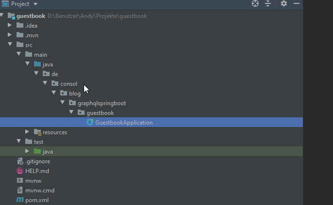 As you can see, the initializer has created an empty project with all the necessary code to run an simple SpringBoot application. We have an GuestbookApplication class which is responsible for startup and configuration, as well as an simple test for even this application class.