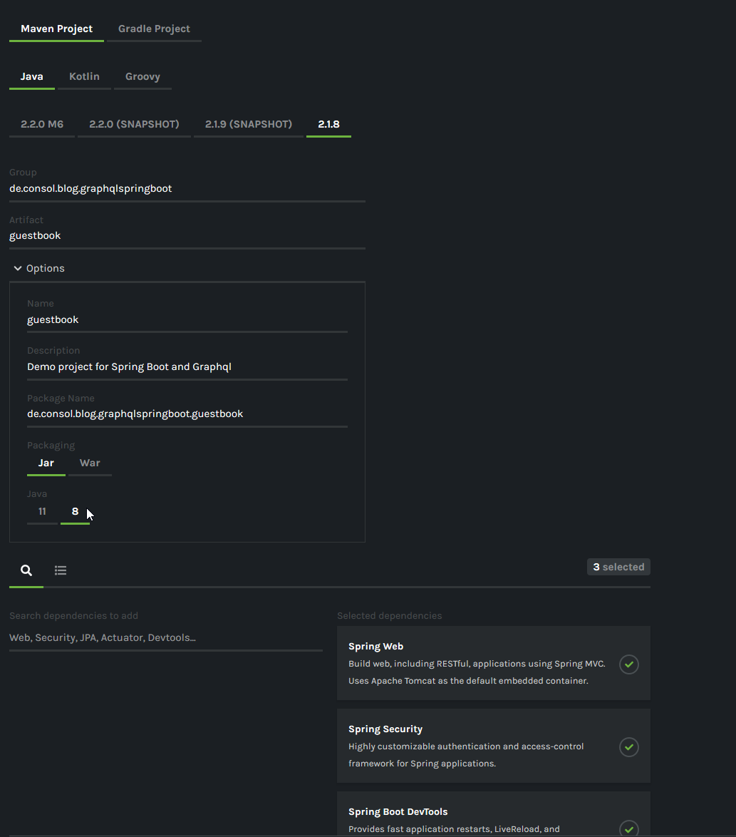 To setup the project from scratch we start at https://start.spring.io/ to select our needed components. On the time writing this article the following settings should be the most actual ones