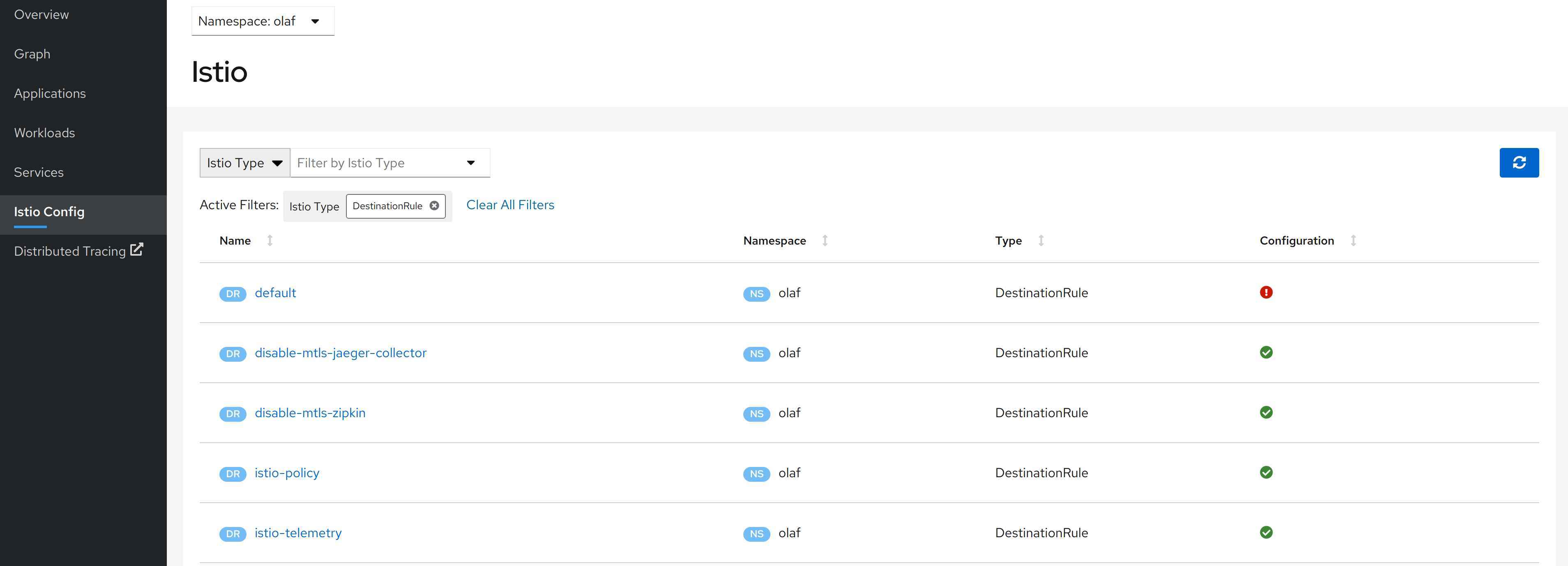 In my case, I forgot to create a global ServiceMeshPolicy. Please note, that this is only a fraction of the tests that Kiali does; but to show all of them would go beyond the scope of the article. A complete list of the validation can be found here.