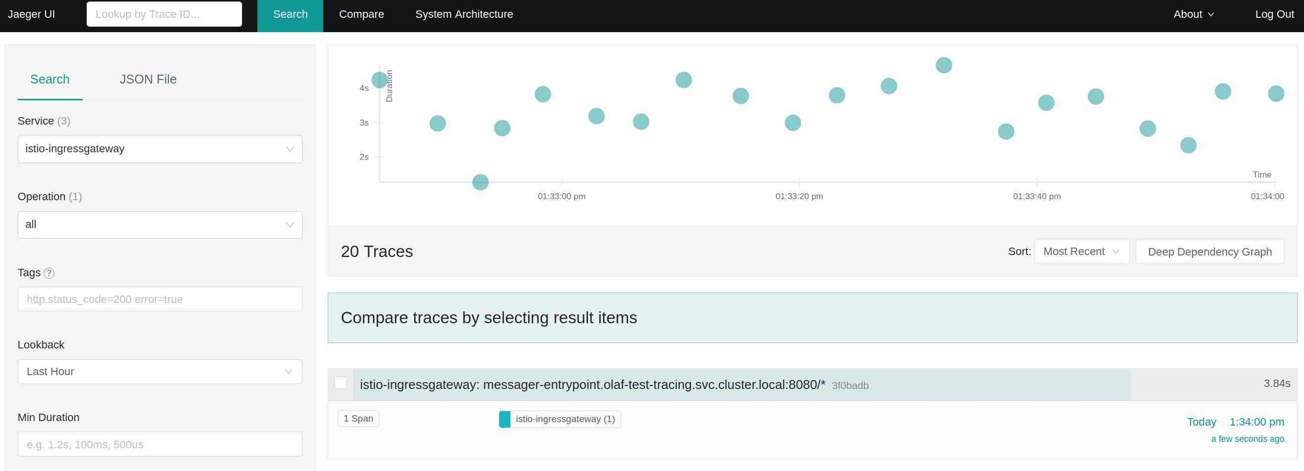The screenshot above shows that Jaeger gets only information about the request to the ingress gateway. It doesn’t show any information about the frontend or backend application. This is not helpful for debugging an application call flow. Istio is generating HTTP headers for tracing. These headers are not processed by the Java application and used in calls of subsequent applications. So, Jaeger gets only information about the incoming request to the container and not how the applications are actually connected.