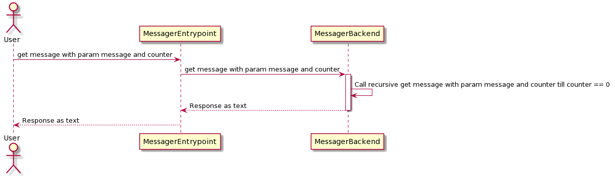 The created demo application can call other applications and mocks internal processing. Hence, I’m fluent in Java, I created a Java REST-Service that takes a message and a counter. The response returns the message. The counter determines the number of recursive method calls. The environment variable BACKEND_SERVICE_URL points to a demo application instance that serves as a backend. If the environment variable is not defined, then a method is called recursively. The request flow of the application looks like this: