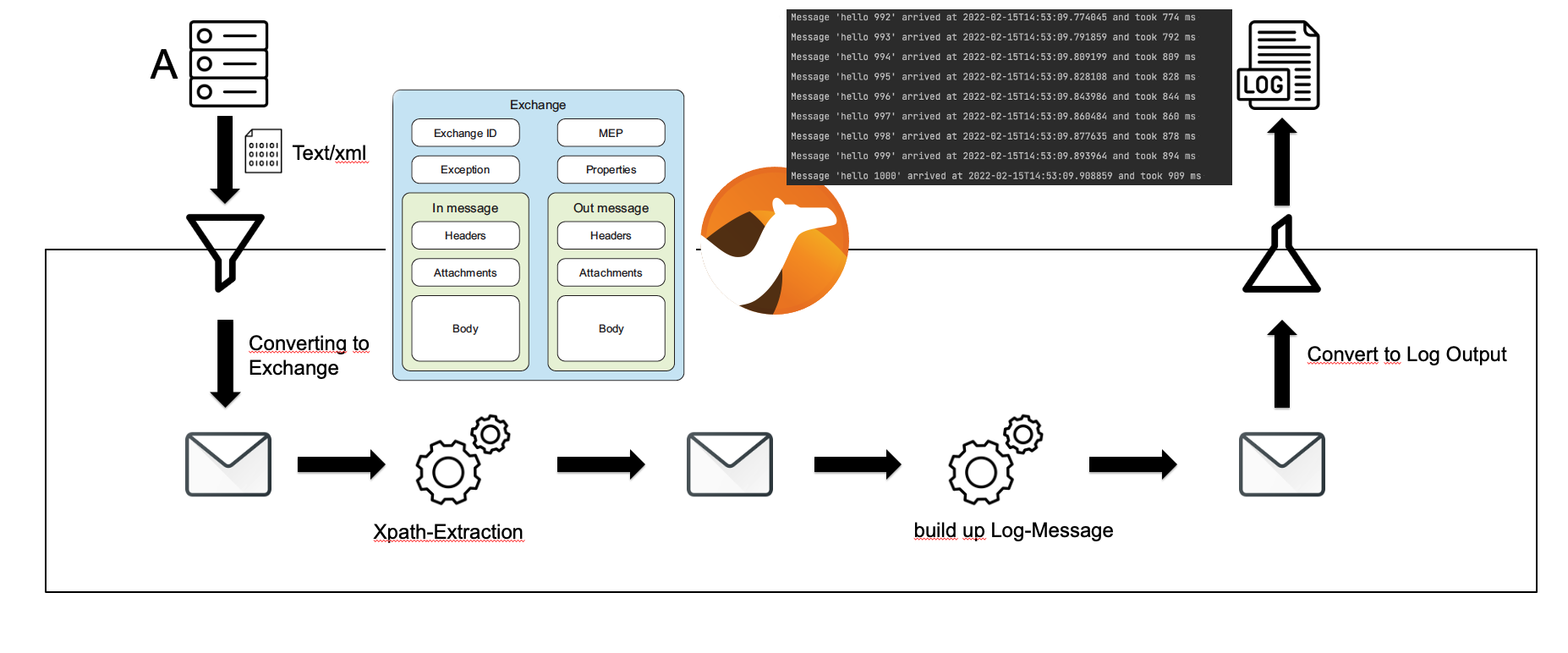 After the incoming data is transformed to an exchange, this exchange is routed to the next step in the process, in our example to the XPath extraction step. Within this an XPath Expression is evaluated against the incoming message body which is basically the payload from the incoming http request. The result from the XPath evaluation is the message string sent from the client. This string is the new body from the out message of the exchange and will be the input for the next step. The next step is the concatenation of the log output. This will then be the input parameter for the log component which is responsible for logging to the given logger.