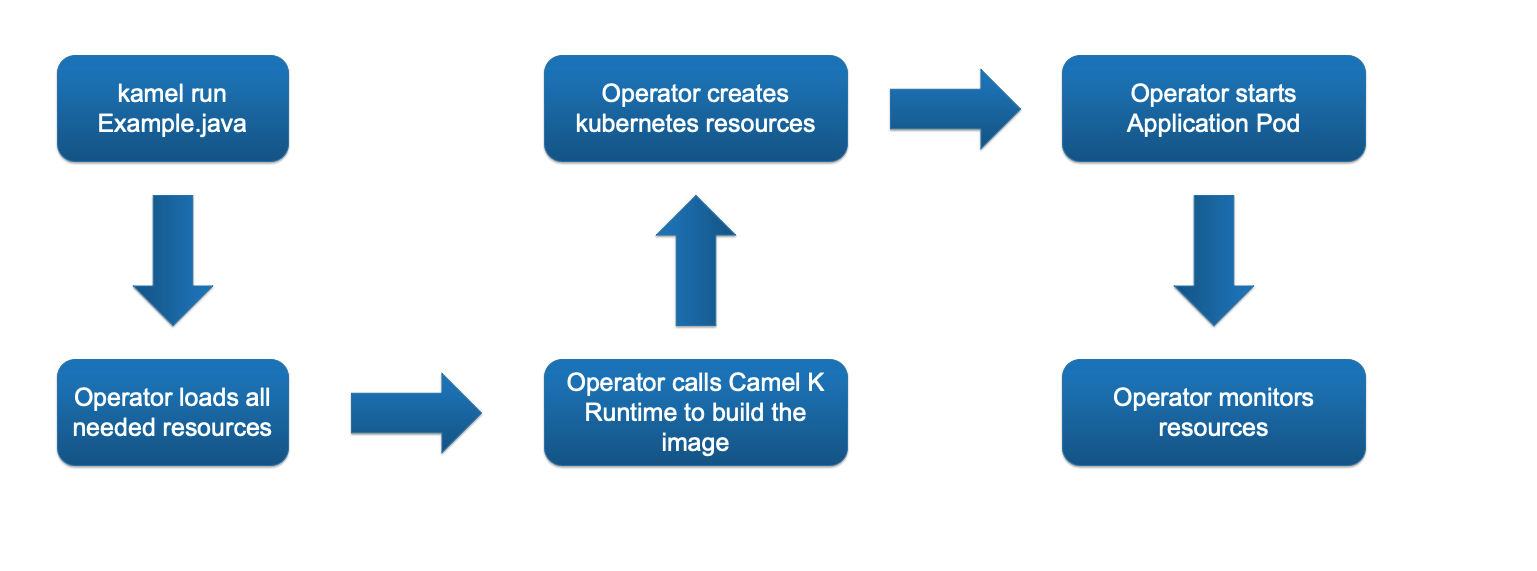 The operator is responsible for creating and gathering all the resources needed for the Camel K Runtime to do their work. After the Camel K Runtime has build the container, the operator will create all the necessary kubernetes resources and will observe their state.