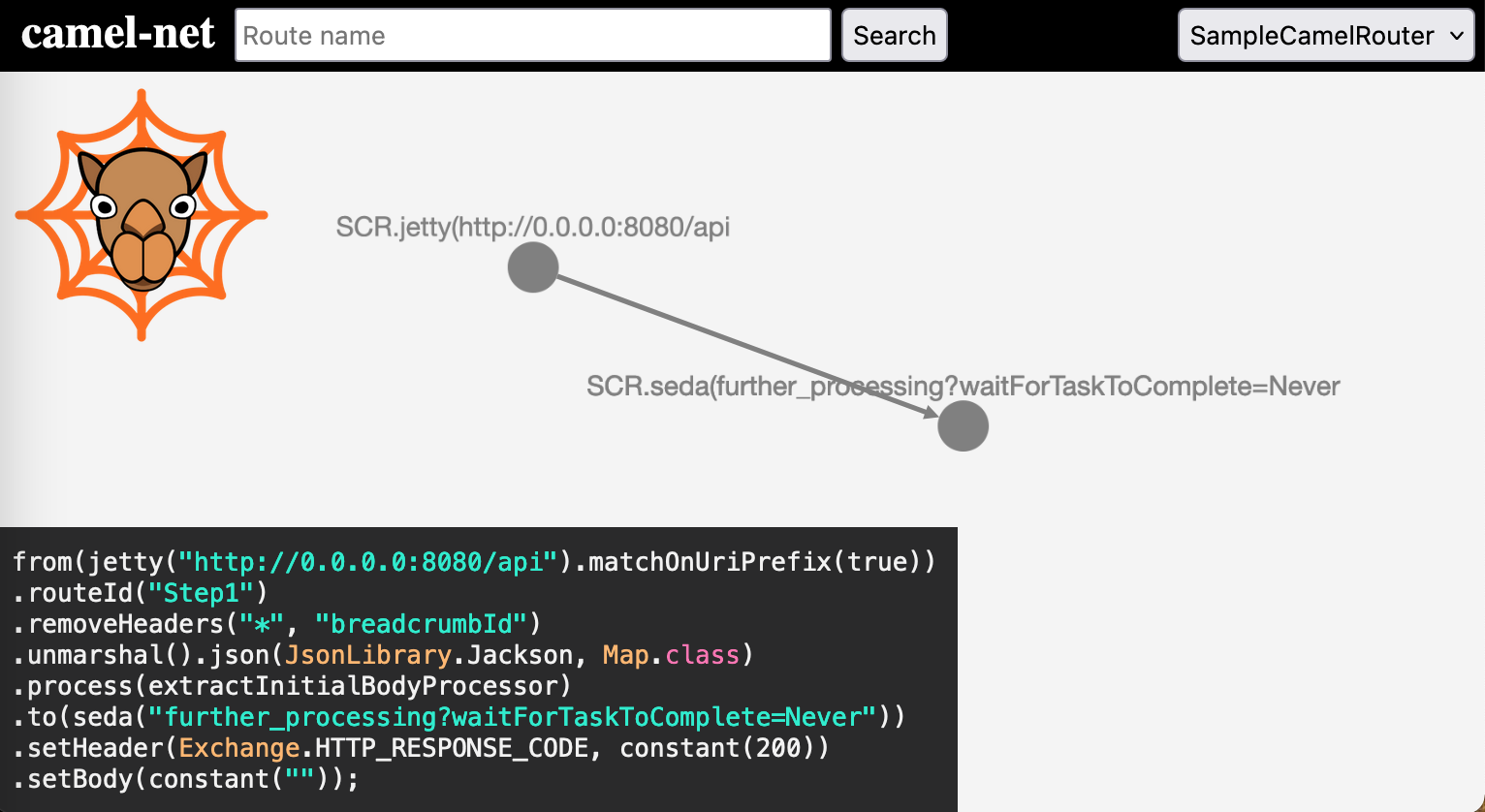 Camel-net parses the source code of an application and creates an interactive graph of the found routes which can be accessed through the started webserver.