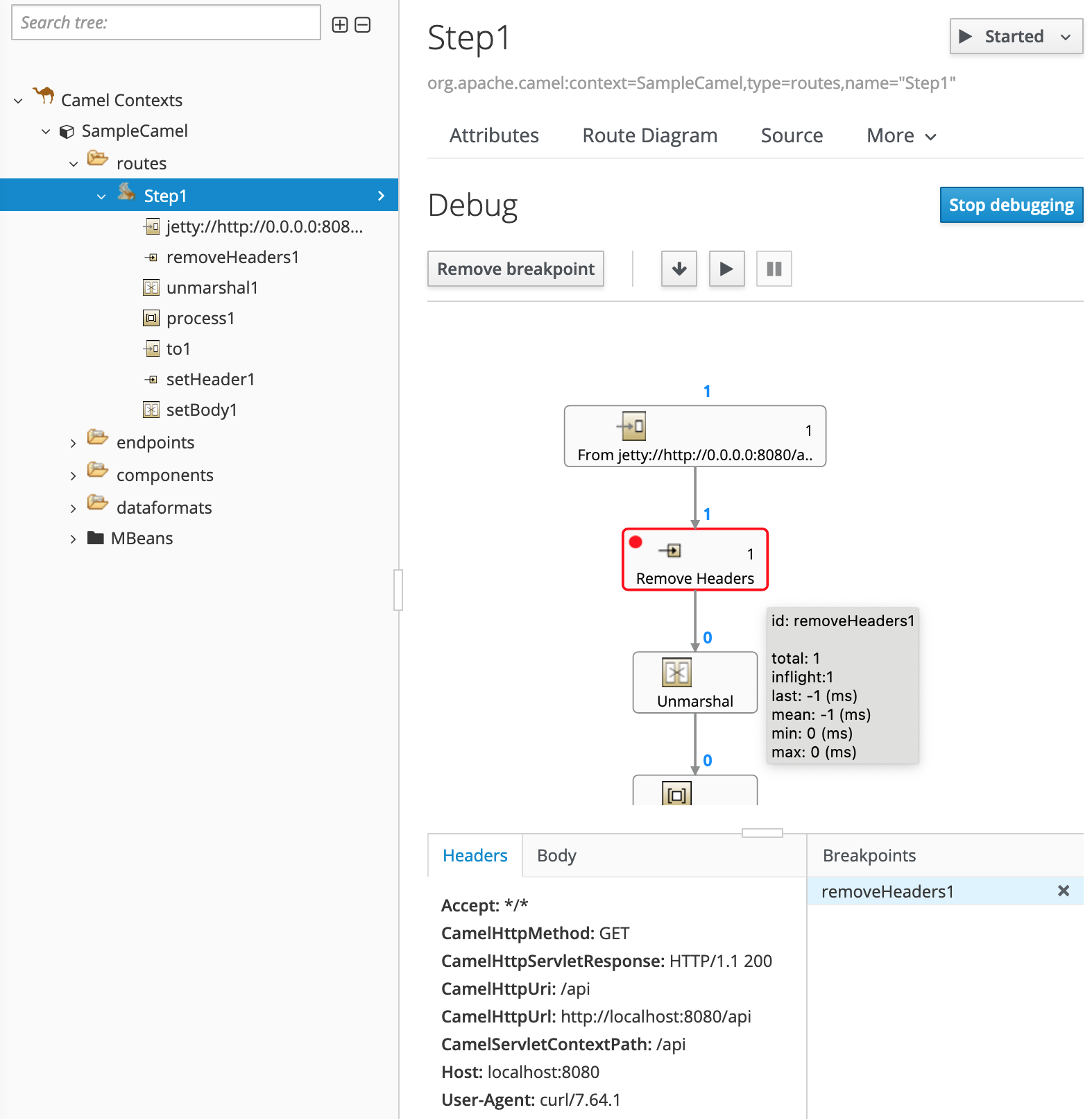- only debug your routes locally Camel Route debugger{:target="_blank"} will fit